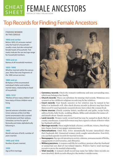 Your female ancestors are tougher to trace than the men in your family. Their maiden names disappeared with marriage. Their roles in history have been less celebrated and recorded. They led private lives. Men served in the military, bought and sold land, sued and were sued—things women rarely did. A married woman's possessions became her husband's. She couldn’t enter into legal contracts without his consent, whether it was writing a will or selling land she inherited.All this means fewer records for you to find about the women in your family tree.Family Tree Magazine's Female Ancestors Cheat Sheet is here to help. It gathers our best advice, tips and reference information for researching the women in your family tree, and organizes it into easy-to-use, at-a-glance format in this printable eight-page PDF. It lists