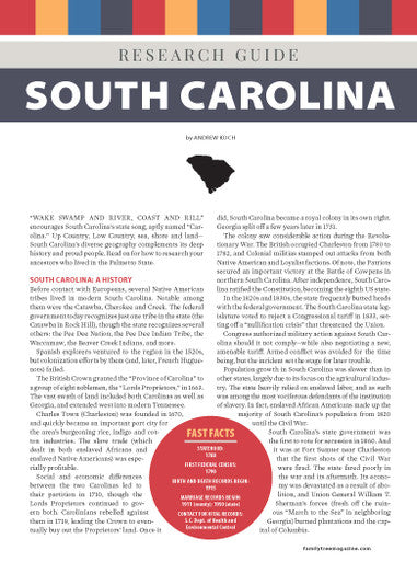 Trace your South Carolina ancestors with the advice and resources in our State Research Guide! This four-page download includes: